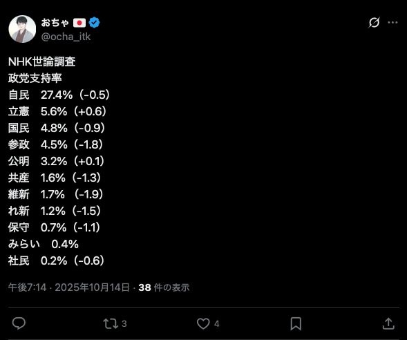 だけど新総裁誕生で普通はそれなりに支持率上がるのにそれがなかったのは厳しい