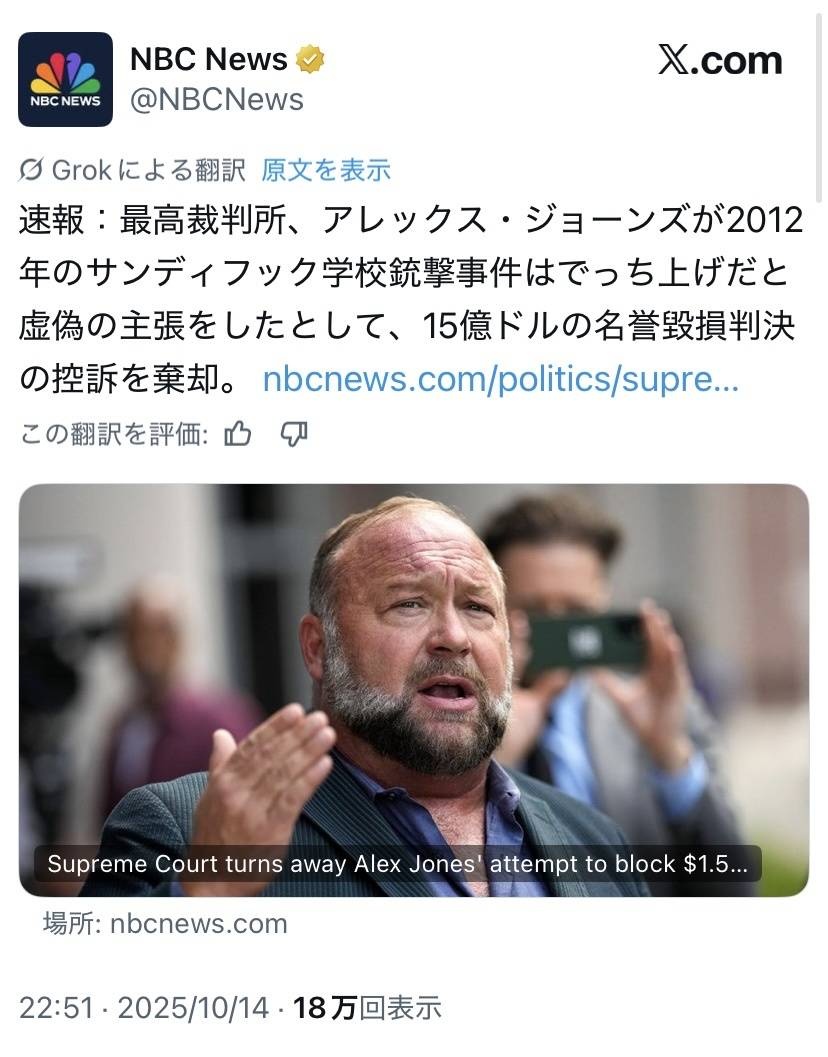 米最高裁、アレックス・ジョーンズの巨額名誉毀損判決の差し止め要求を却下