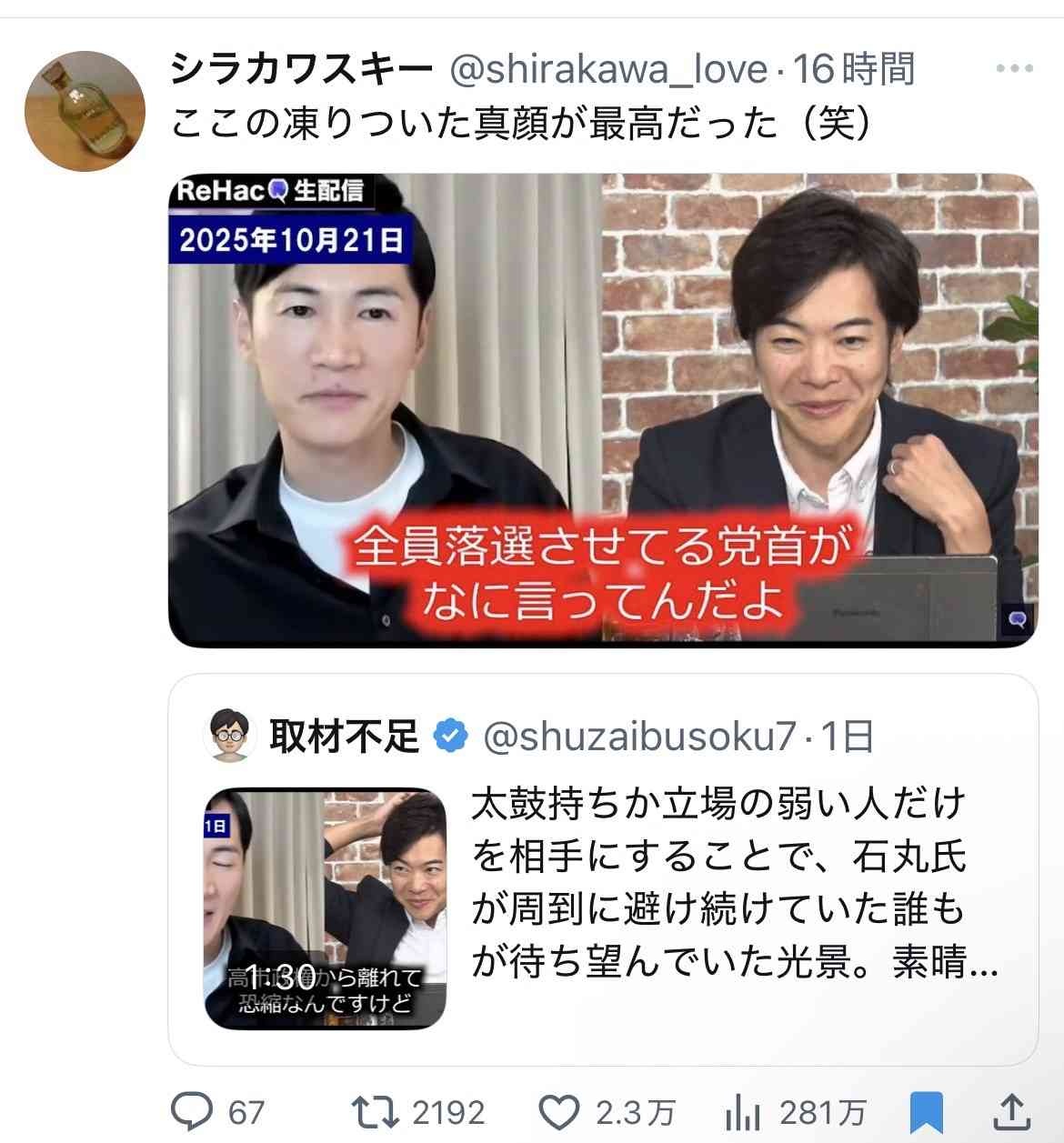 なんかもうどっちも小物感がすごいんやけどこんなんで政治語られても困るやろ