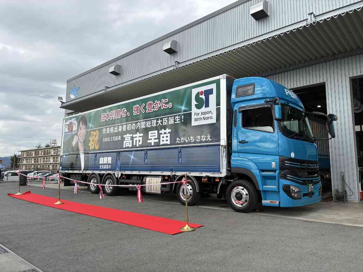 三菱ふそう製の最新型10トントラックに、笑顔で握りこぶしを掲げる高市氏の写真をあしらい、「日本列島を、強く豊かに。」「祝 奈良県出身者初の内閣総理大臣誕生!」などの文字を添えた。車両ナンバーは「早苗」にちなみ「37-77」とした。