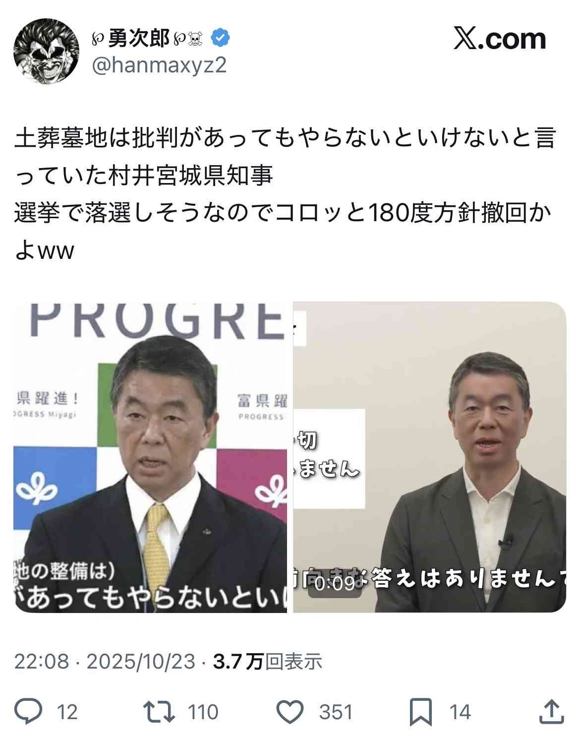 「土葬は批判があってもやる」と言っていた宮城県知事の村井、参政党にビビってしまい「二度と土葬は検討しない」と明言www