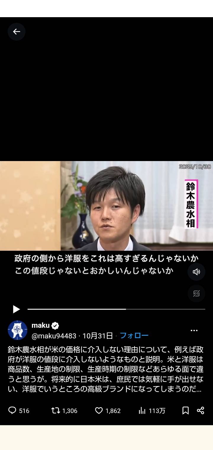 記者「お米の値段下げる気は無い?」農水大臣「例えば服が高いからって政府が『服安くしろ!』とか言う訳ないですよね?wそれと同じ」