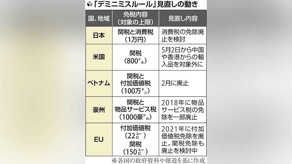 米国のトランプ政権が中国からの輸入品に適用を停止するなど、世界でも見直しの動きが広がっている。財務省 来年以降の税制改正を見据え、少額輸入品に消費税を課すことを想定している。