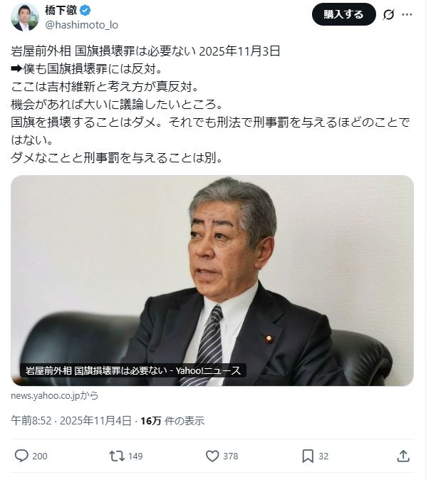 橋下徹「国旗損壊罪には反対、国旗を損壊することはダメ。それでも刑法で刑事罰を与えるほどのことではない