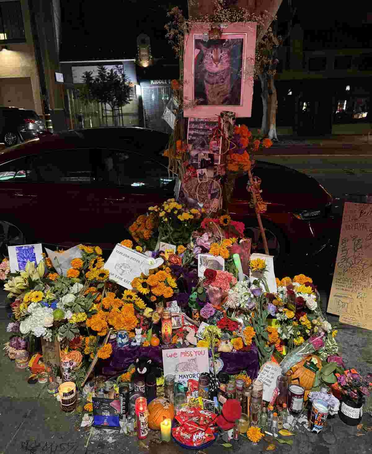 下の方に[TH]E MAYOR OF 16th…が見切れてる事からたま駅長的な看板猫だろう