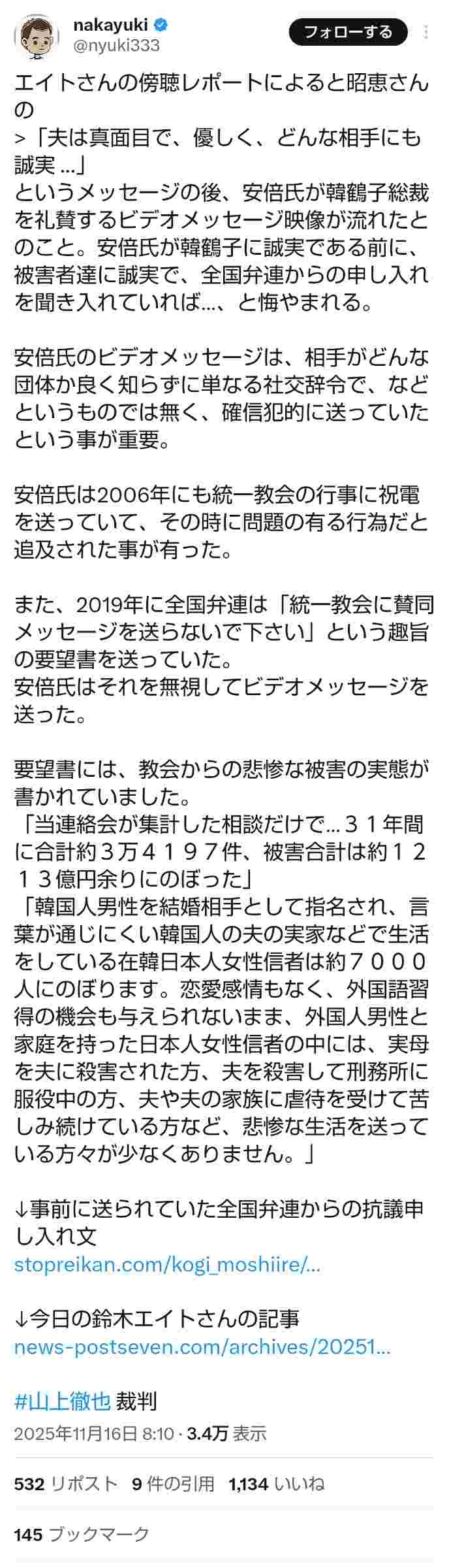 犯行と統一教会は関係ないと弁護側が要求する証人拒否してるくせになんで、統一プロパガンダ動画垂れ流してるの?やっぱ検察も壺じゃねーか
