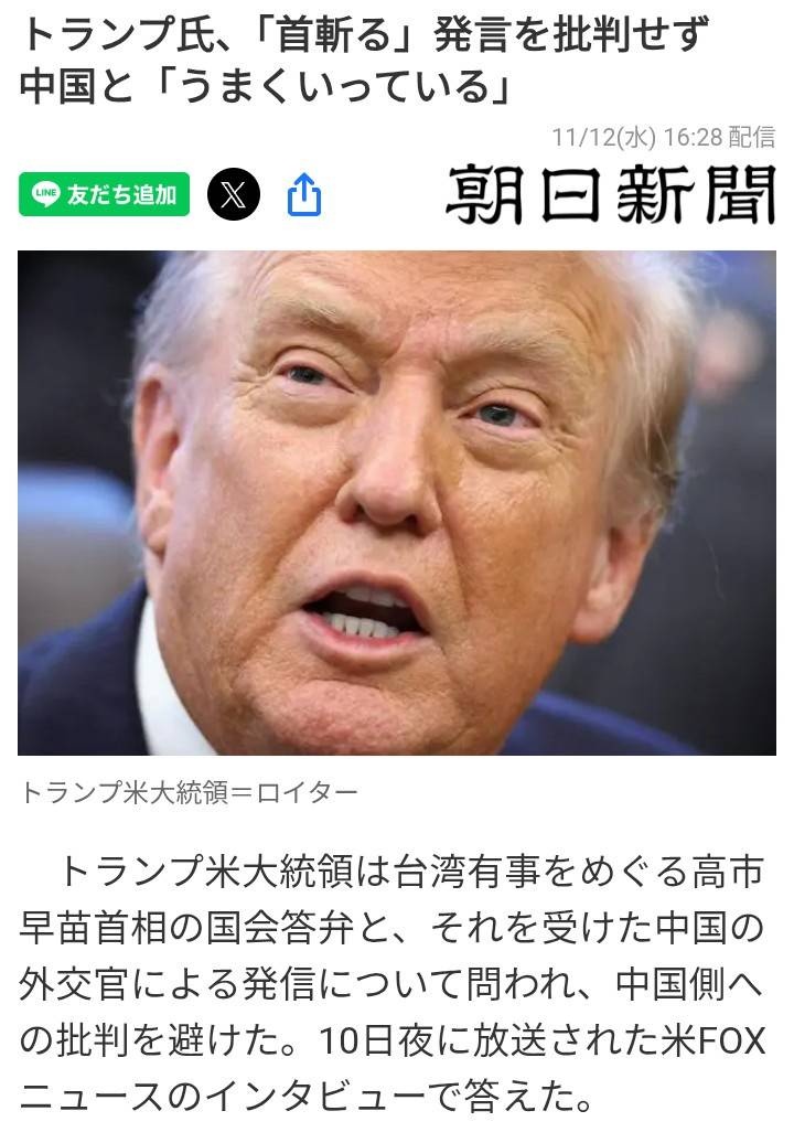 CNNテレビは7月、トランプ氏が昨年の大統領選期間中に、中国が台湾に侵攻したら「北京を爆撃する」と発言したと報じた。だが、今月のFOXニュースのインタビューでは、首相答弁への受け止めを聞かれても直接の言及を控えた。
