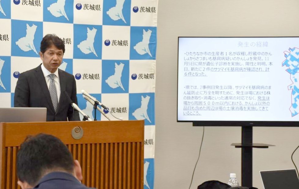 干し芋の産地、茨城県ひたちなか市内で病害「サツマイモ基腐(もとぐされ)病」の感染が相次いでいることから、県は18日、同市全域を対象に独自の「緊急事態宣言」を出した。大井川和彦知事が記者会見を開き、同日新たに2例確認したことを明らかにした上で、「基腐病が広がってきている可能性が出てきた。しっかりと根絶することで産地を守っていきたい」と強調。感染拡大により収穫量の大幅な減少など深刻な事態につながる可能性があるとして、生産者らに防疫措置への協力を求めた。