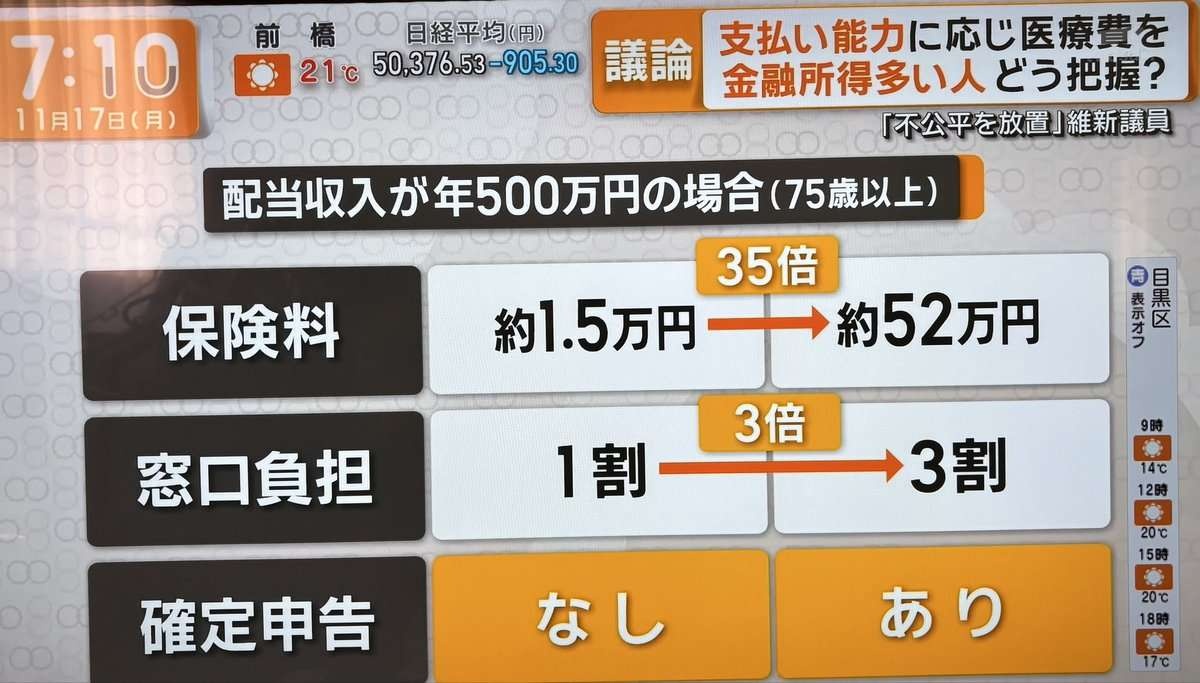 現行の国民健康保険や75歳以上の後期高齢者医療制度では、所得に応じて窓口負担や保険料が決まる。上場株式の配当などの所得は確定申告しなければ算定の対象に入らず、負担に反映されないため、不公平との指摘がある。自民党と日本維新の会の連立政権合意書でも「金融所得の反映」の推進が明記されていた。
