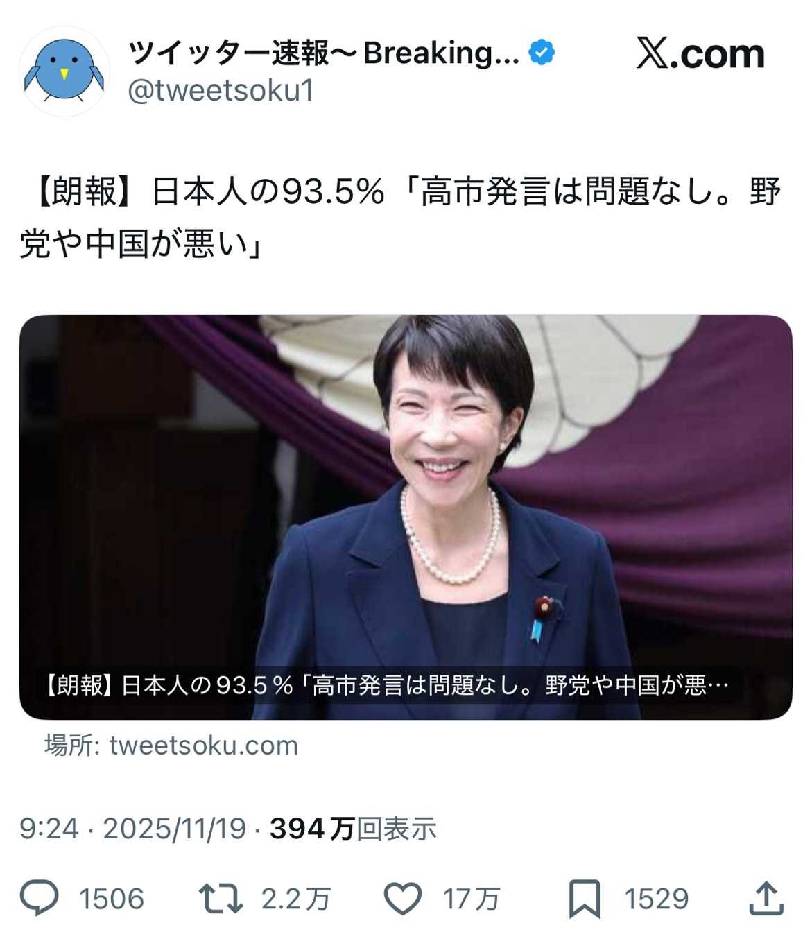 2025年11月19日、「【朗報】日本人の93.5%『高市発言は問題なし。野党や中国が悪い』」という投稿がXで拡散した。