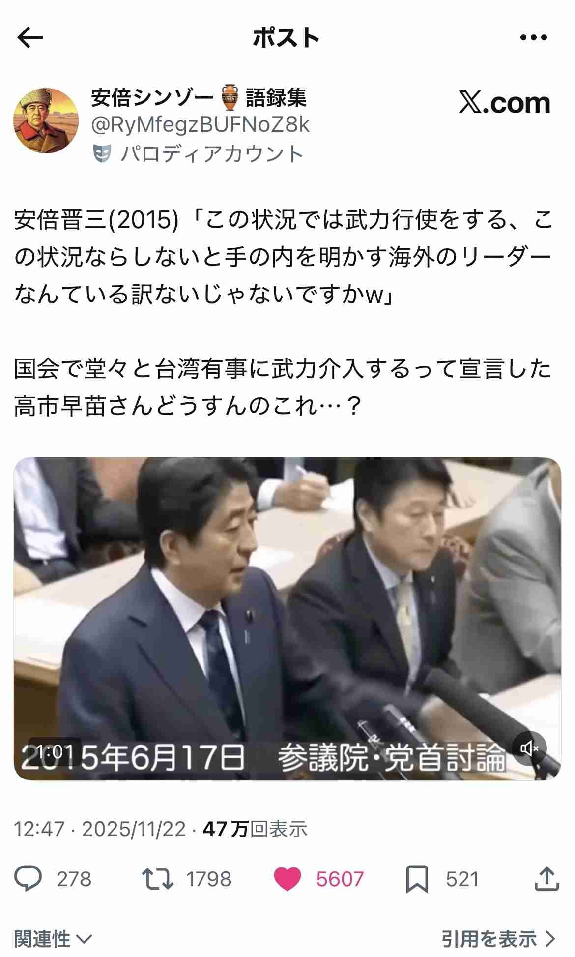 これは国際的にもですね、そんなことをいちいちすべて述べている海外のですね、リーダーというのはほとんどいないということは申し上げておきたいと思います。 安倍シンゾー🏺語録集 (@RyMfegzBUFNoZ8k) on X安倍晋三(2015)「この状況では武力行使をする、この状況ならしないと手の内を明かす海外のリーダーなんている訳ないじゃないですかw」 国会で堂々と台湾有事に武力介入するって宣言した高市早苗さんどうすんのこれ⋯?x.com