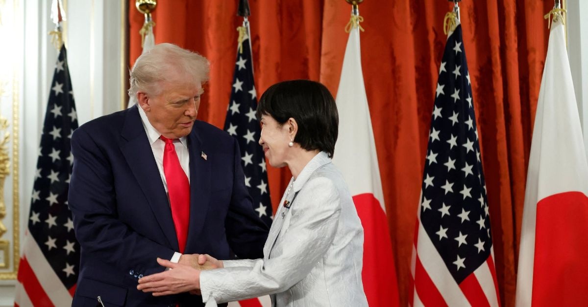 写真は握手するトランプ米大統領と高市早苗首相。都内で10月代表撮影。REUTERS