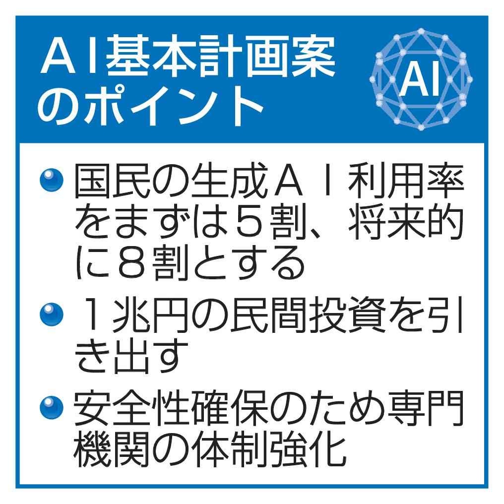 基本計画はAIの推進に向けた政府の施策を列挙したもので、策定は初めて。計画案は1日時点のもので政府は有識者らの意見を踏まえて調整を進め、年内の閣議決定を目指す。