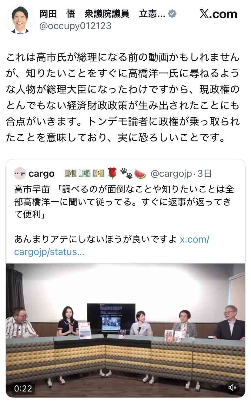 高市って7時に帰宅して高橋洋一門田隆将へずまほんこんの動画を見て、官僚のレクチャーを拒否しながら午前3時に用意させた原稿を秘書官と一緒に仲良く赤ペンで自分の言葉で書き直してるんだよな