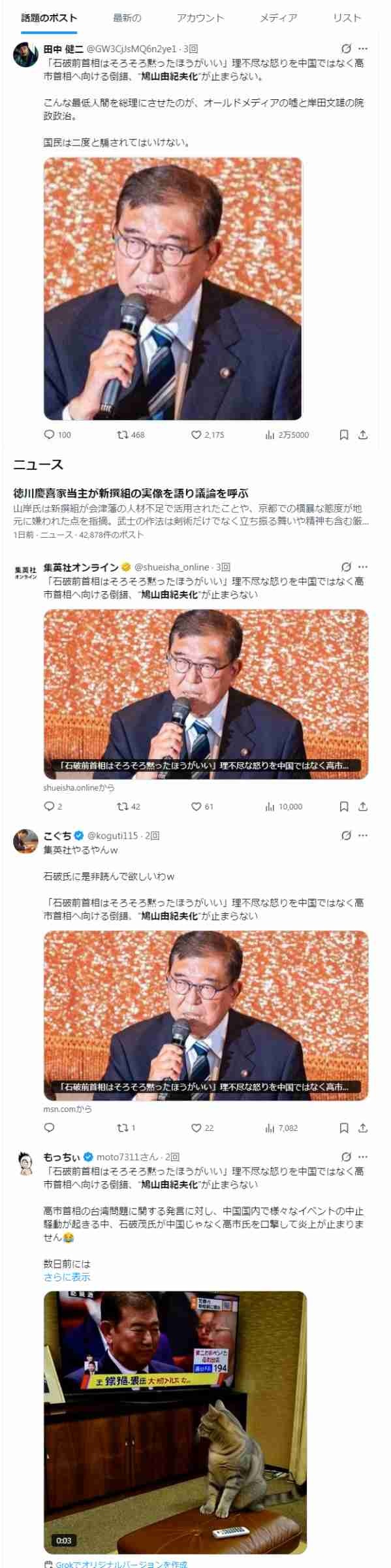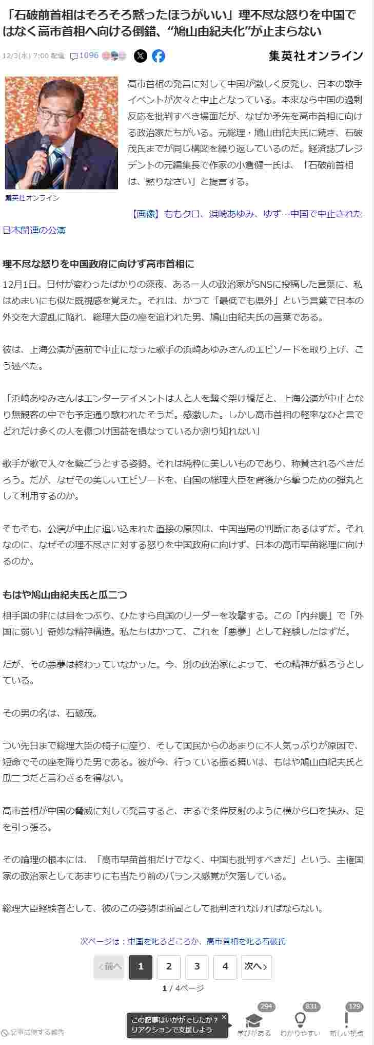 集英オンライン「石破前首相はそろそろ黙ったほうがいい」理不尽な怒りを中国ではなく高市首相へ向ける鳩山由紀夫化が止まらない