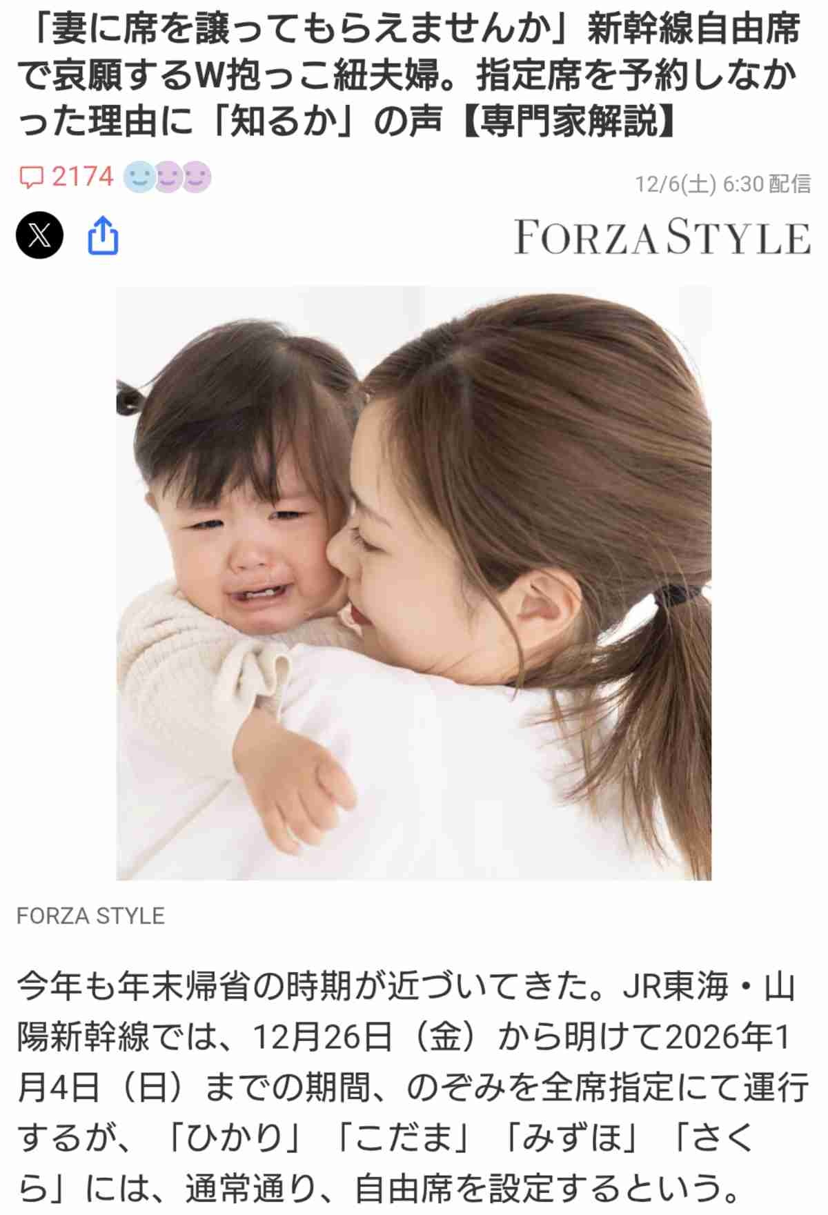 「妻に席を譲ってもらえませんか」新幹線自由席で哀願するW抱っこ紐夫婦。指定席を予約しなかった理由に「知るか」の声【専門家解説】(FORZA STYLE) - Yahoo!ニュース