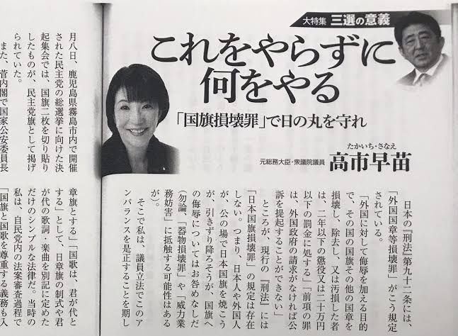 高市氏は自民が野党だった2012年、同様の法案作成を主導した。当時、自らのホームページで国旗を損壊する行為は「国旗に対して多くの国民が抱く尊重の念を害するものだ」と主張していた。