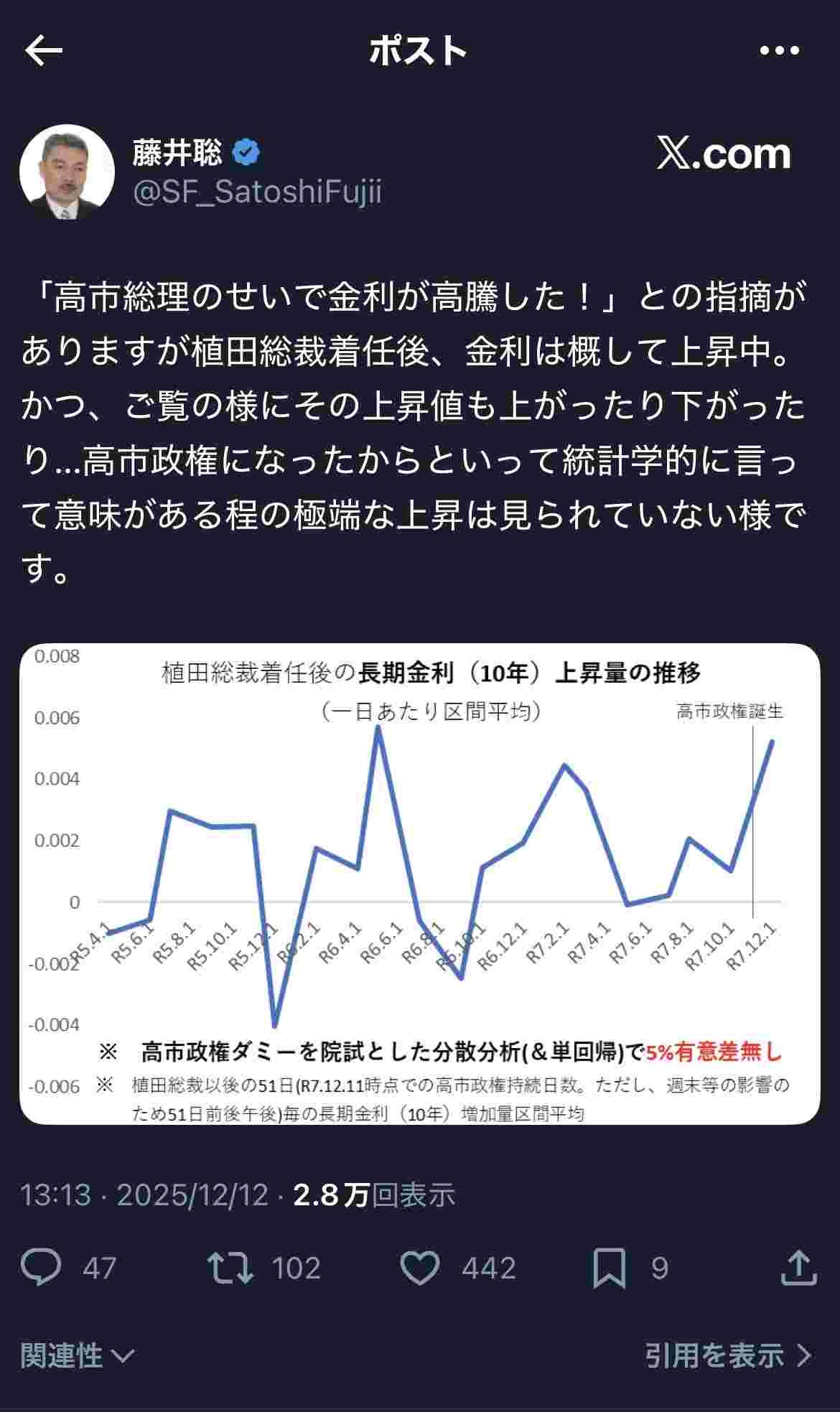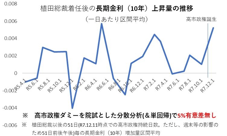 「高市総理のせいで金利が高騰した!」との指摘がありますが植田総裁着任後、金利は概して上昇中。かつ、ご覧の様にその上昇値も上がったり下がったり…高市政権になったからといって統計学的に言って意味がある程の極端な上昇は見られていない様です。