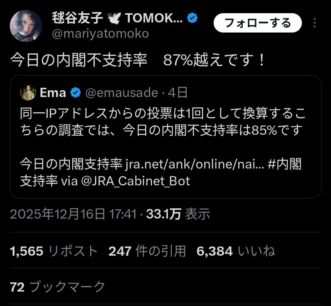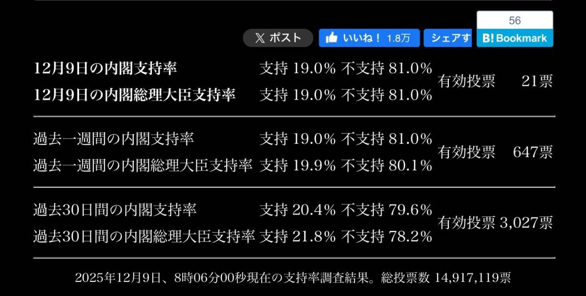 高市早苗内閣、最新内閣支持率が激減42.85%…支持率ののが支えだったのにもう駄目だろこれwww