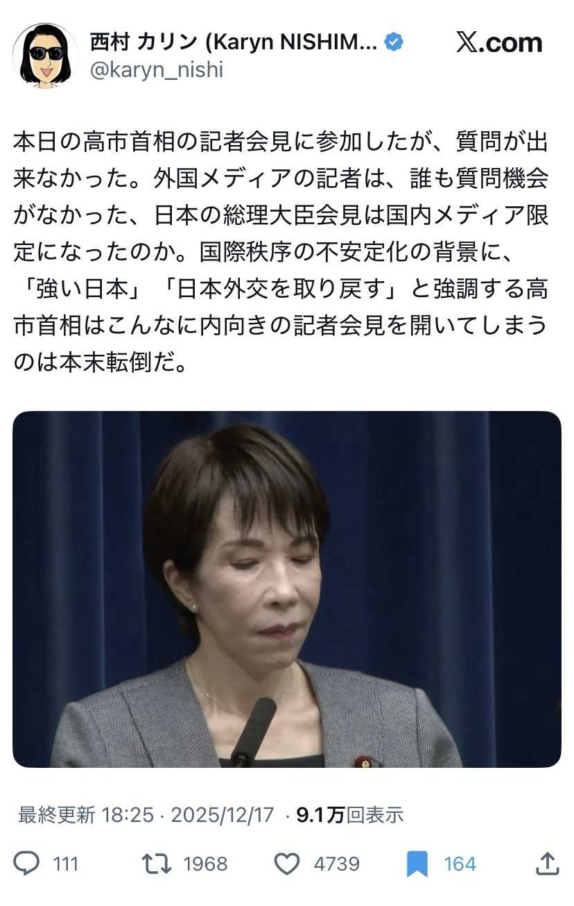 高市の指示とかではなく周りが気を遣って外国メディアに当てないようにしている
