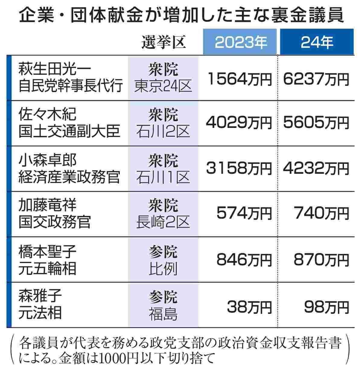 佐々木紀国土交通副大臣の支部(5605万円)や小森卓郎経済産業政務官の支部(4232万円)も23年を上回った。