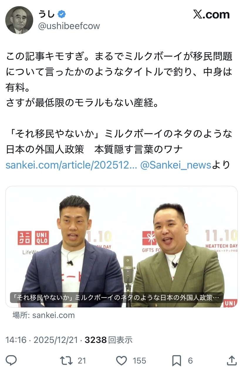 ミルクボーイさんが誰なのかは知らないけど愛国的発言に好感持てたのでこれから応援する予定