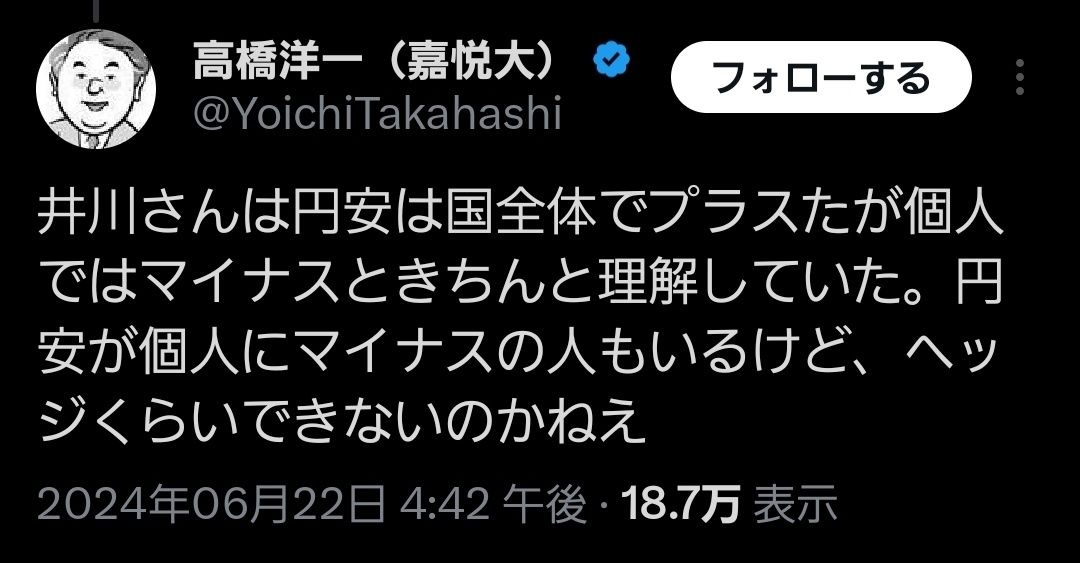 高市のブレーン、トケドロ高橋「円安が個人にマイナスなのは当たり前😤ヘッジぐらいしろよ!」🤔