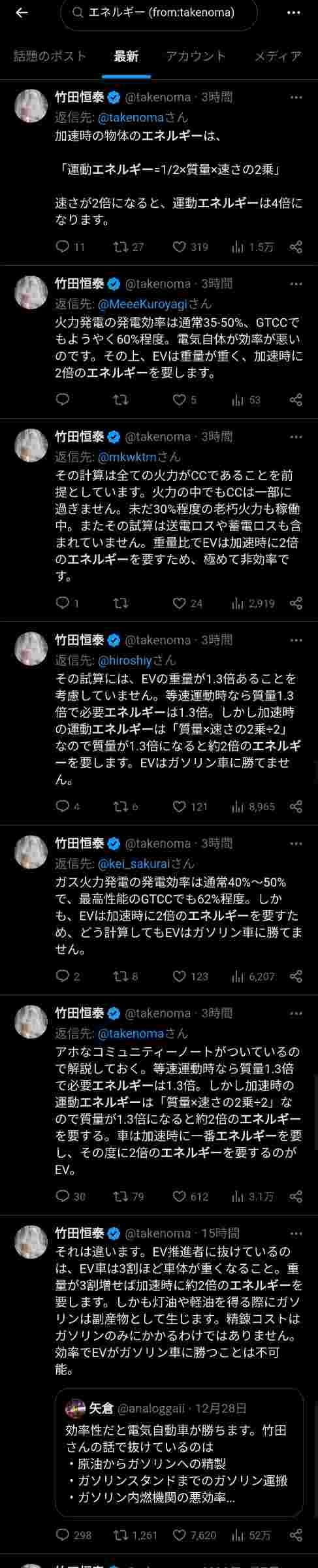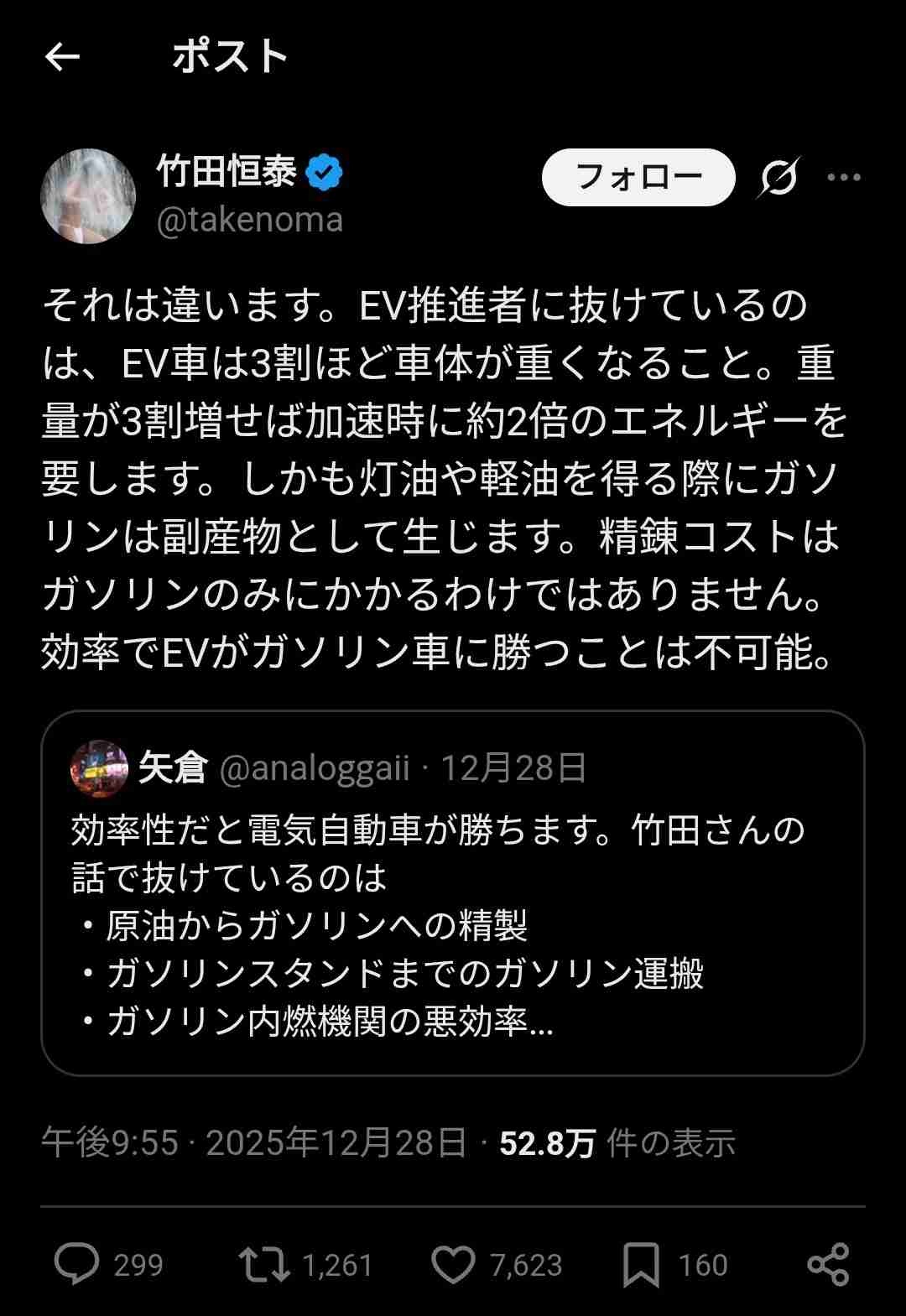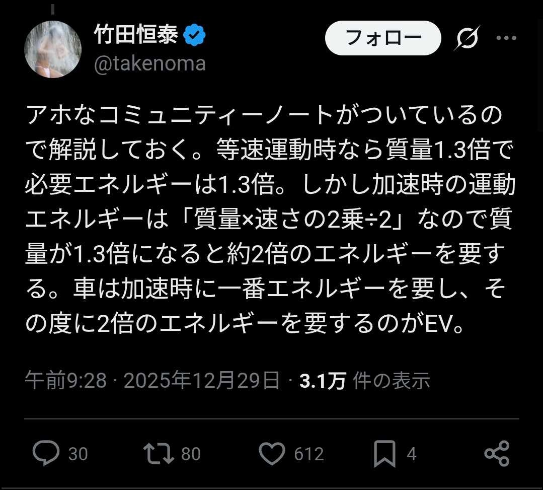 竹田天皇「EVはガソリン車の1.3倍、加速時のエネルギーは『質量×速さの2乗÷2』だからガソリン車の2倍のエネルギーを使う」