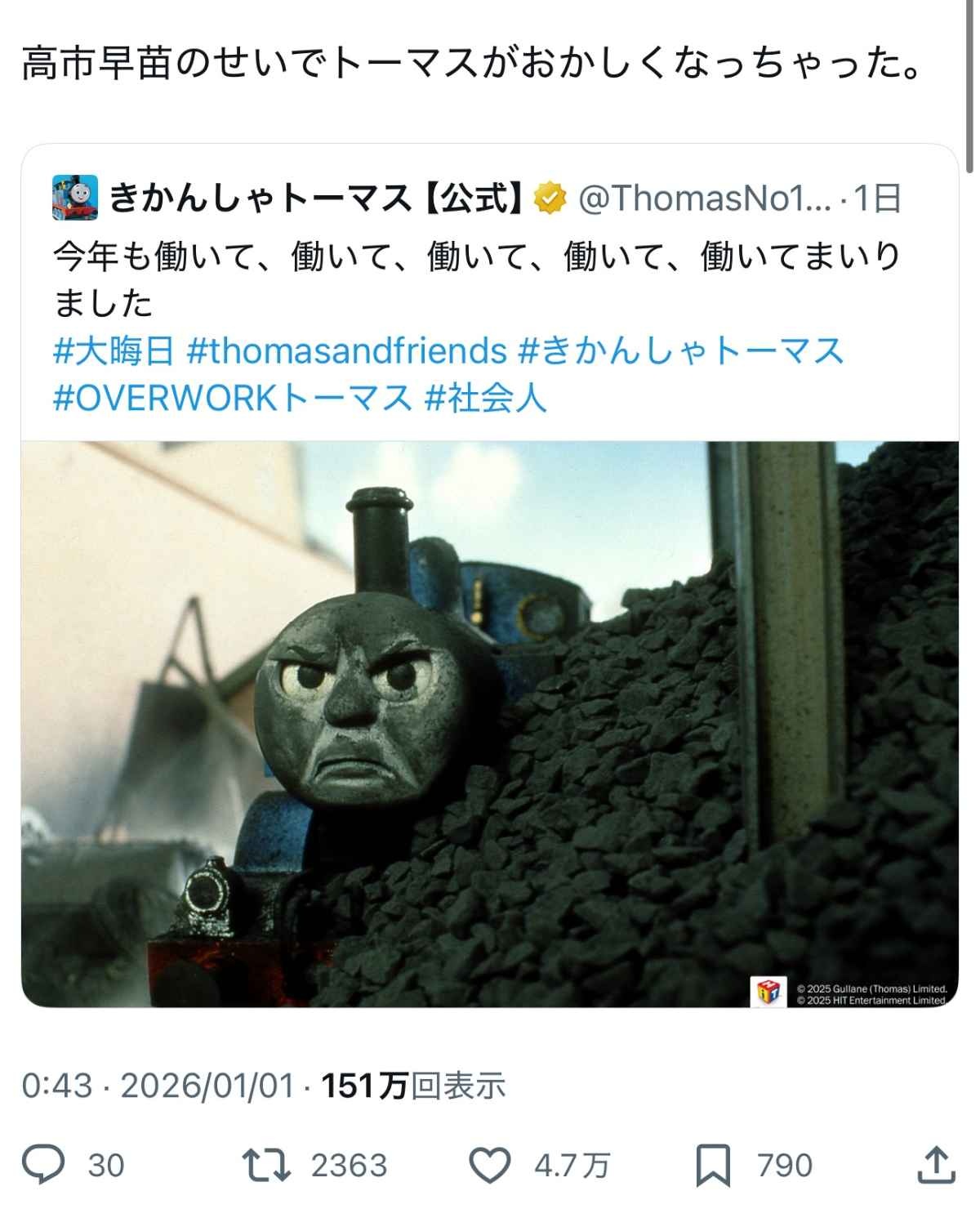 働きすぎて痴漢者トーマスになったかと思った