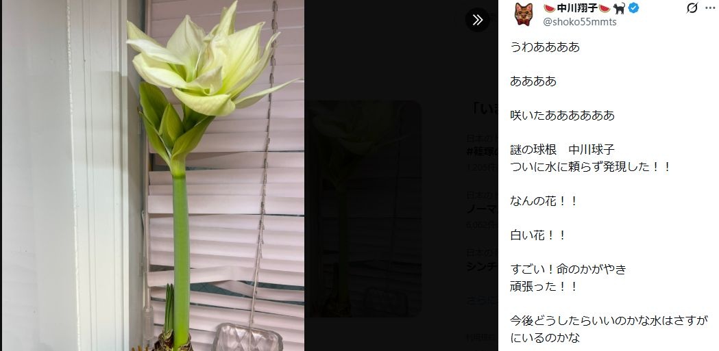 6日正午、中川はツイッターを更新し、「うわああああああああ咲いたああああああ」「謎の球根 中川球子、ついに水に頼らず発現した!」と、ついに