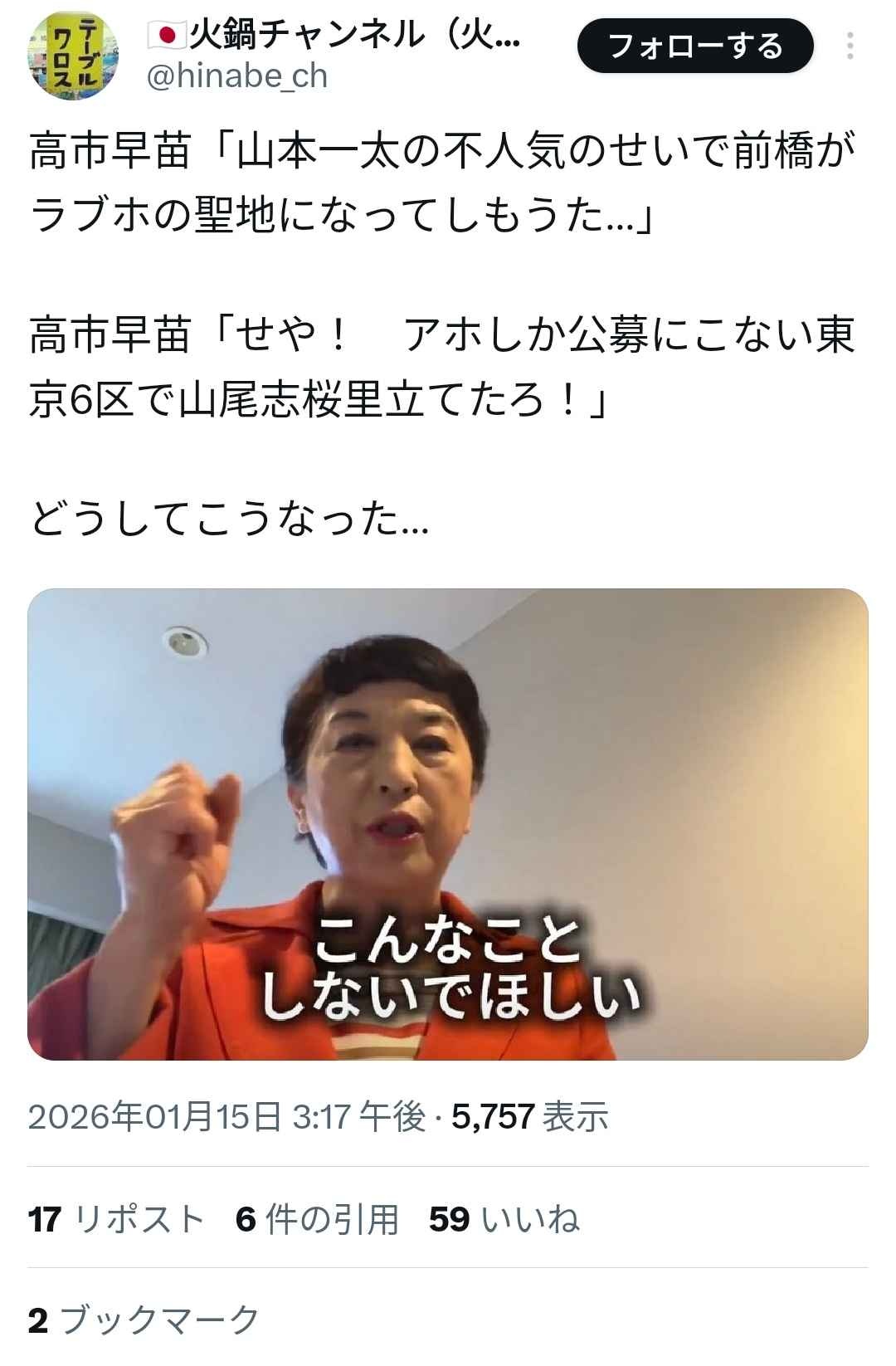 ウヨ化した山尾も高市が推せば応援するんだろw