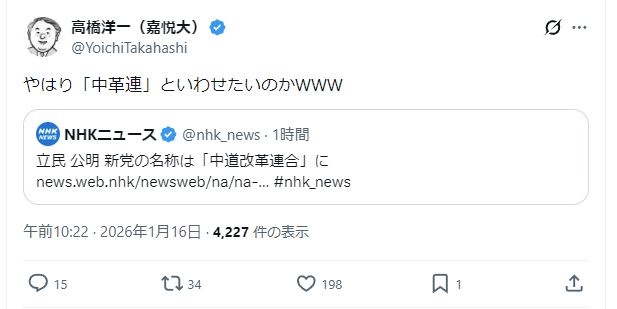 高橋洋一「やはり「中革連」といわせたいのかWWW」立民 公明 新党の名称は「中道改革連合」に