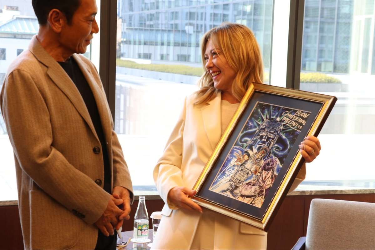 来日中のイタリア🇮🇹のメローニ首相と原哲夫が本日、東京都内で面会しました‼メローニ首相が誕生日だったこともあり、メッセージ付きジークレー版画をプレゼントさせていただき握手を交わしました✨