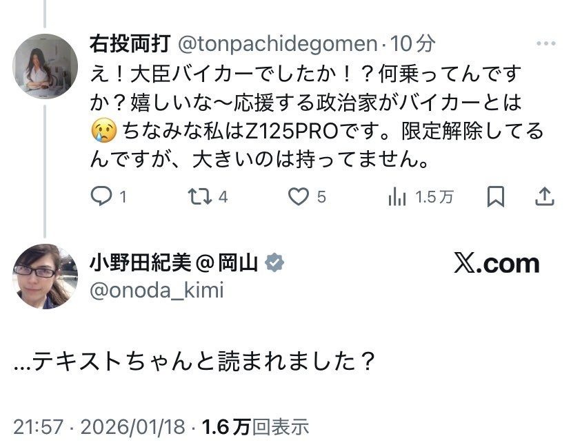 おぢ「そりゃ🇯🇵大臣が🏍乗ってるなんてヒミツ🤫ですよネ⁉💦💦💦ちなみに小生は限定解除💪です😆💦💦💦」