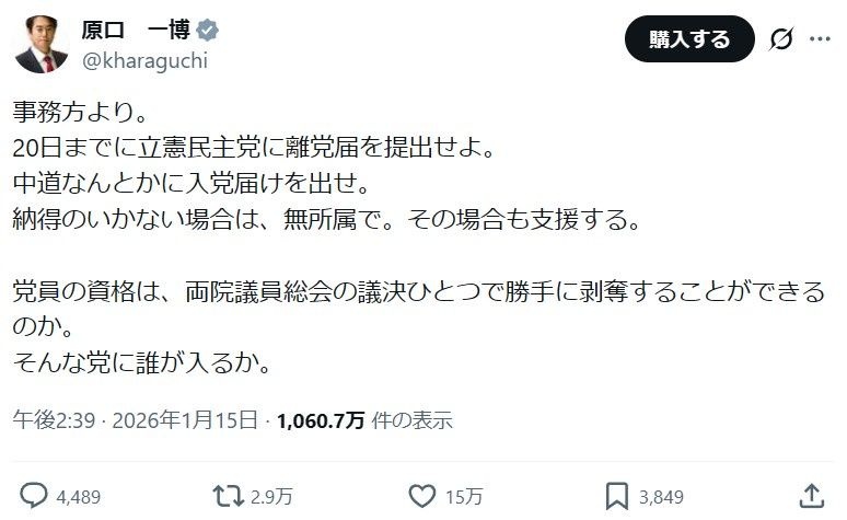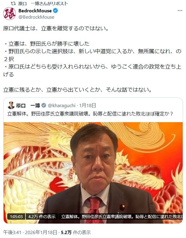 原口一博氏「今日は私、立憲民主党員としての最後の日」決別宣言「ゆうこく連合」の会見を予告