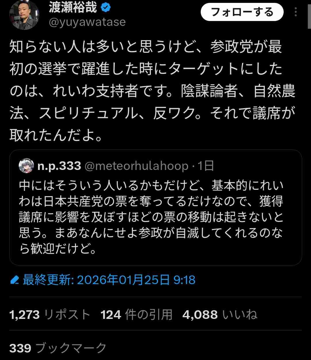 元々スピリチュアルとかオーガニックの人はれいわにハマってたんよな。そこを参政党が奪い取った