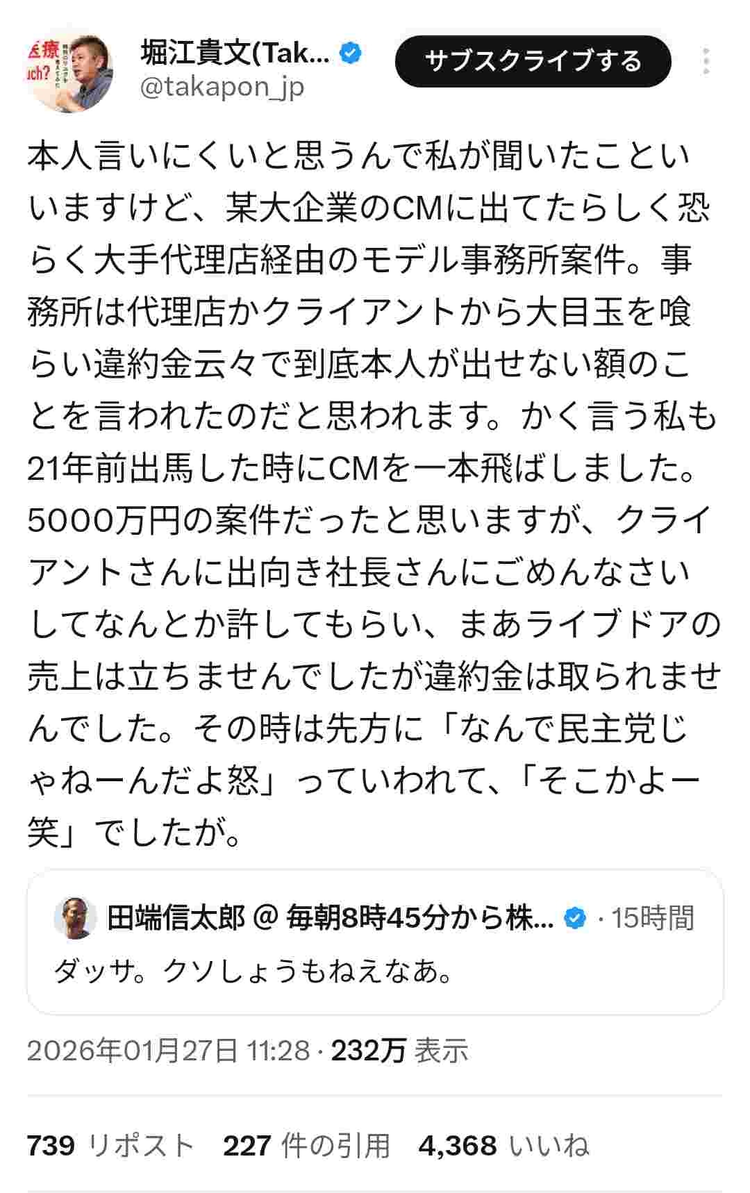 ホリエモン曰く「メインでは無いし、映ってる時間も短いのにめんどくせーな」