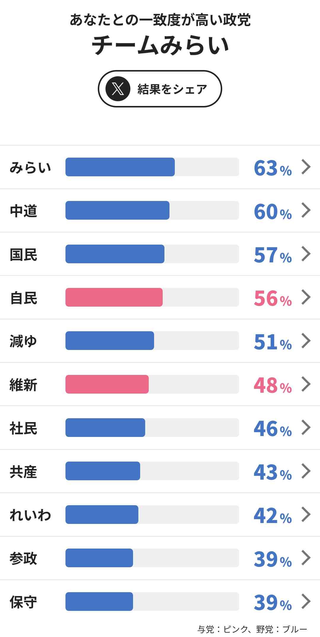 選択肢の真ん中へんばかりを選んだら中道が75%で共鳴度トップだった