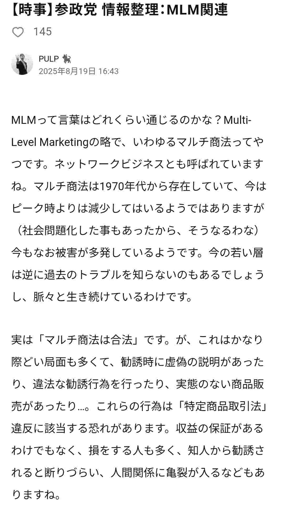 マルチ商法やってた奴を応援できる参政党支持者凄いよな