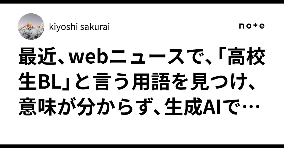 最近、webニュースで、「高校生BL」と言う用語を見つけ、意味が分からず、生成AIで、検索し、それに対応する用語は、「女子高生GL」と悟りましたが、私の時代には、前者は、ホモ、後者は、レスビアンと言う表現で、BLと言う話は、聞いたことがなく、あるいは、世の中には、GLは、存在するかもしれず、私の時代から60年経た、現在社会では、BL=Boy’s Love、GL=Girl’s Loveは、どのくらい存在するのか、テレビドラマで、BLの大人版を観ましたが、気持ち悪く、違和感を覚えました。|kiyoshi sakurai