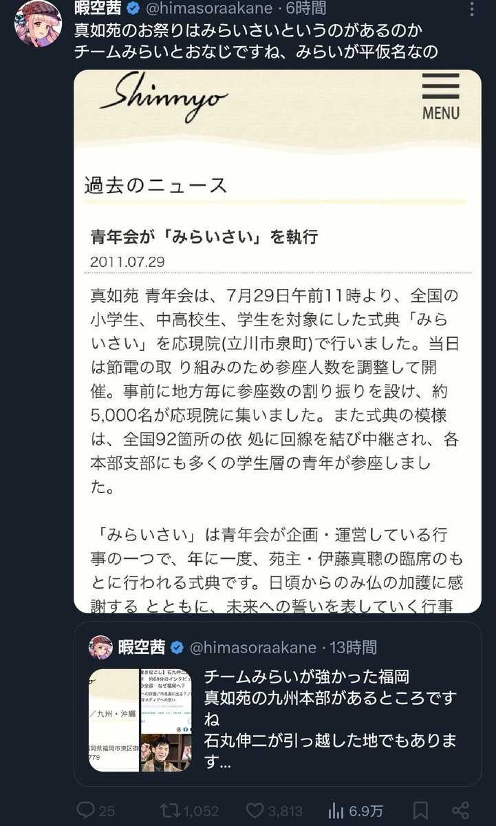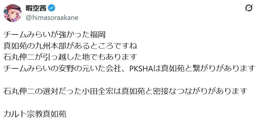 堀口くんが小さい時、母親に真如苑の集会に連れて行かれるのが嫌だったって話から何故か暇さんの中で真如苑が巨悪になってった大スペクタクルや
