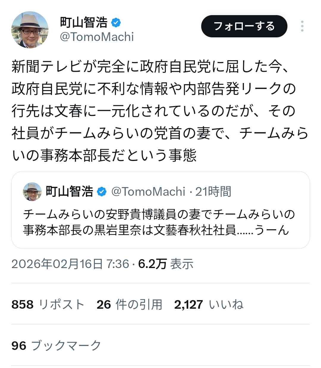 文春がチームみらいのスキャンダルも報じてるの知らないのか