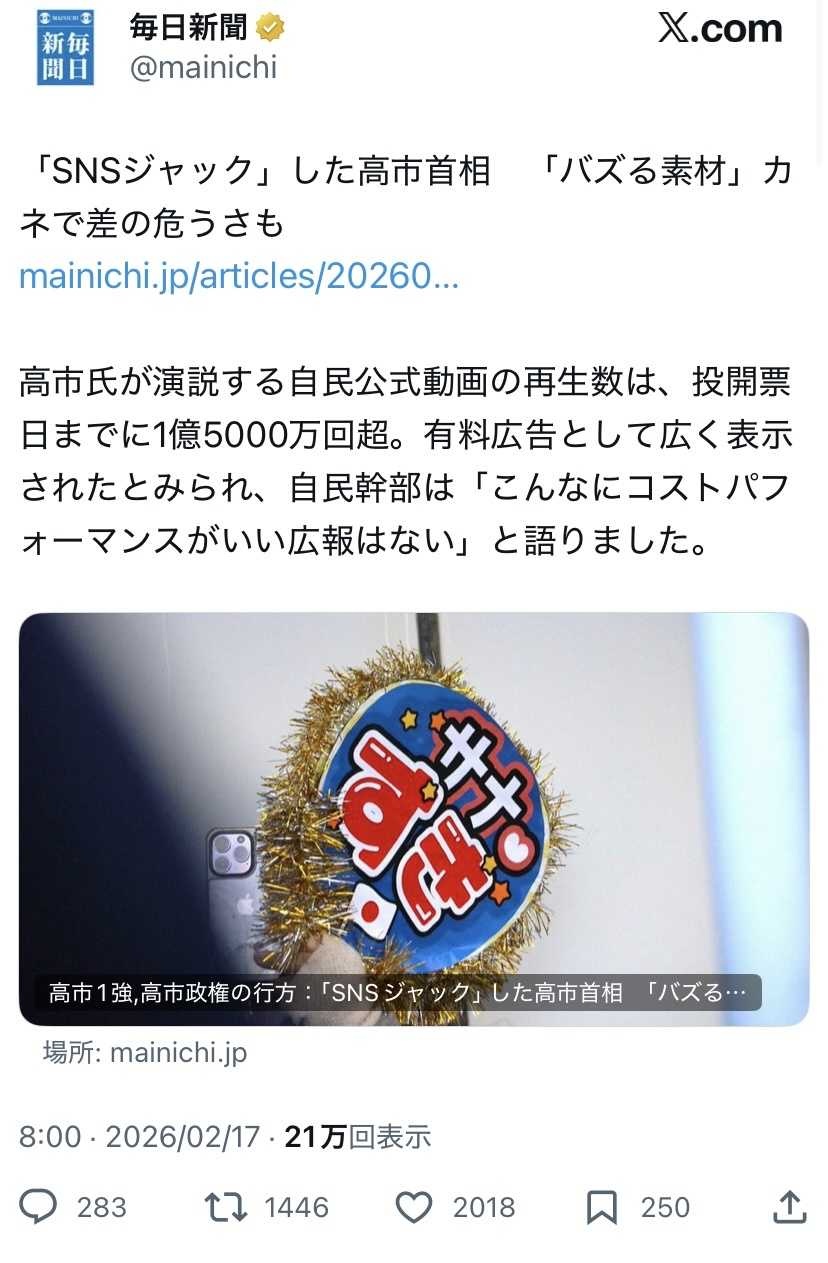 自民幹部「高市首相の動画が1億5000万回再生。こんなにコスパがいい広報はない」