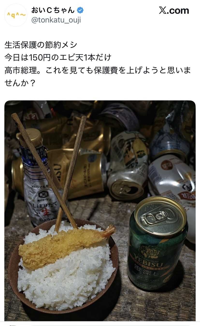 【画像】( ヽ´ん`) 「晩御飯は海老天1本、高市総理、生活保護費を上げてください」