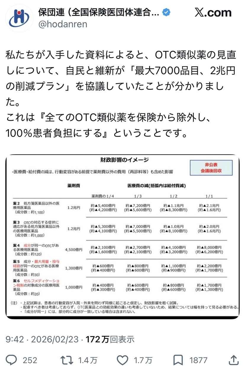 高市政権、OTC類似薬7000品目を保険外しへへ