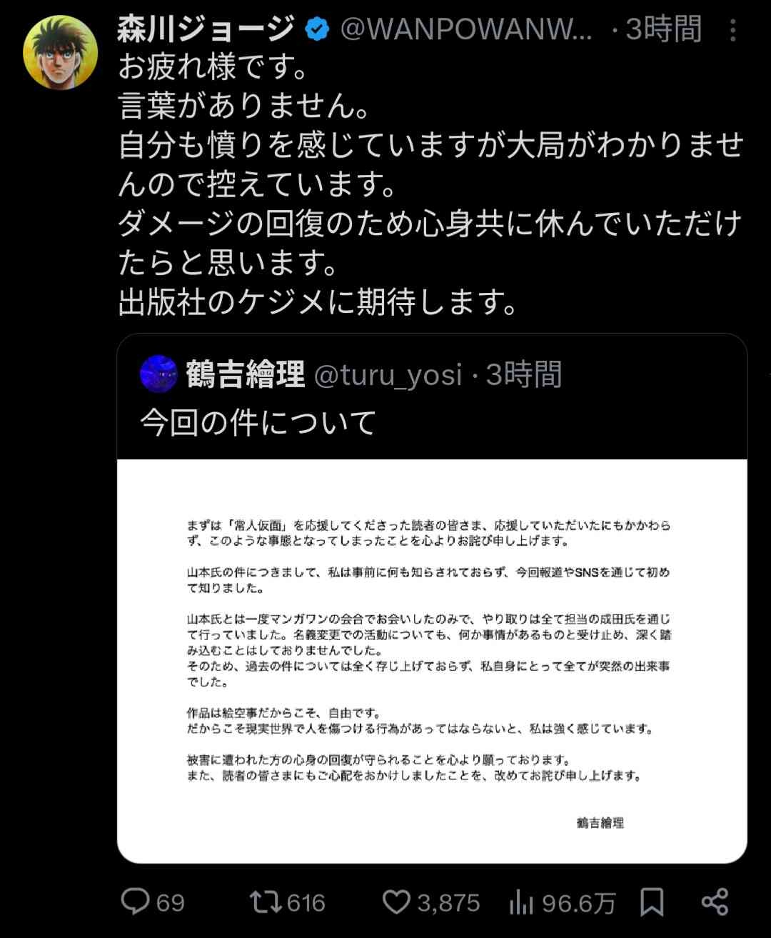 国民的人気マンガ「はじめの一歩」作者、小学館の騒動をうけお気持ちを表明