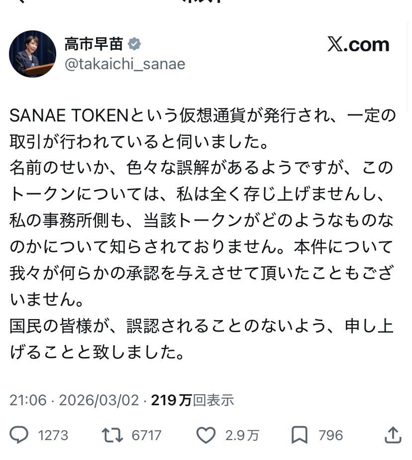 そもそも、たとえ私が自費で仮想通貨をつくったとしても、サナエトークンなんかにはしないですよ。普通、これは常識で考えて当たり前じゃないですか。私はそんなタイプの人間ではないんですよ。