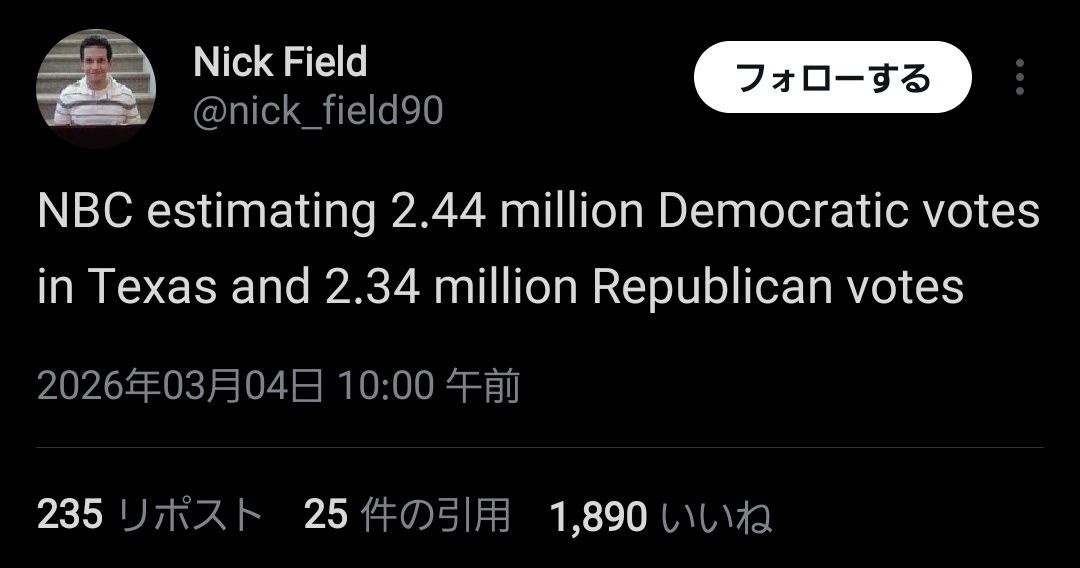トランプ「ギャーー」 テキサス州の予備選挙で民主党の投票数が共和党の投票数を上回る 高市早苗「うおw」