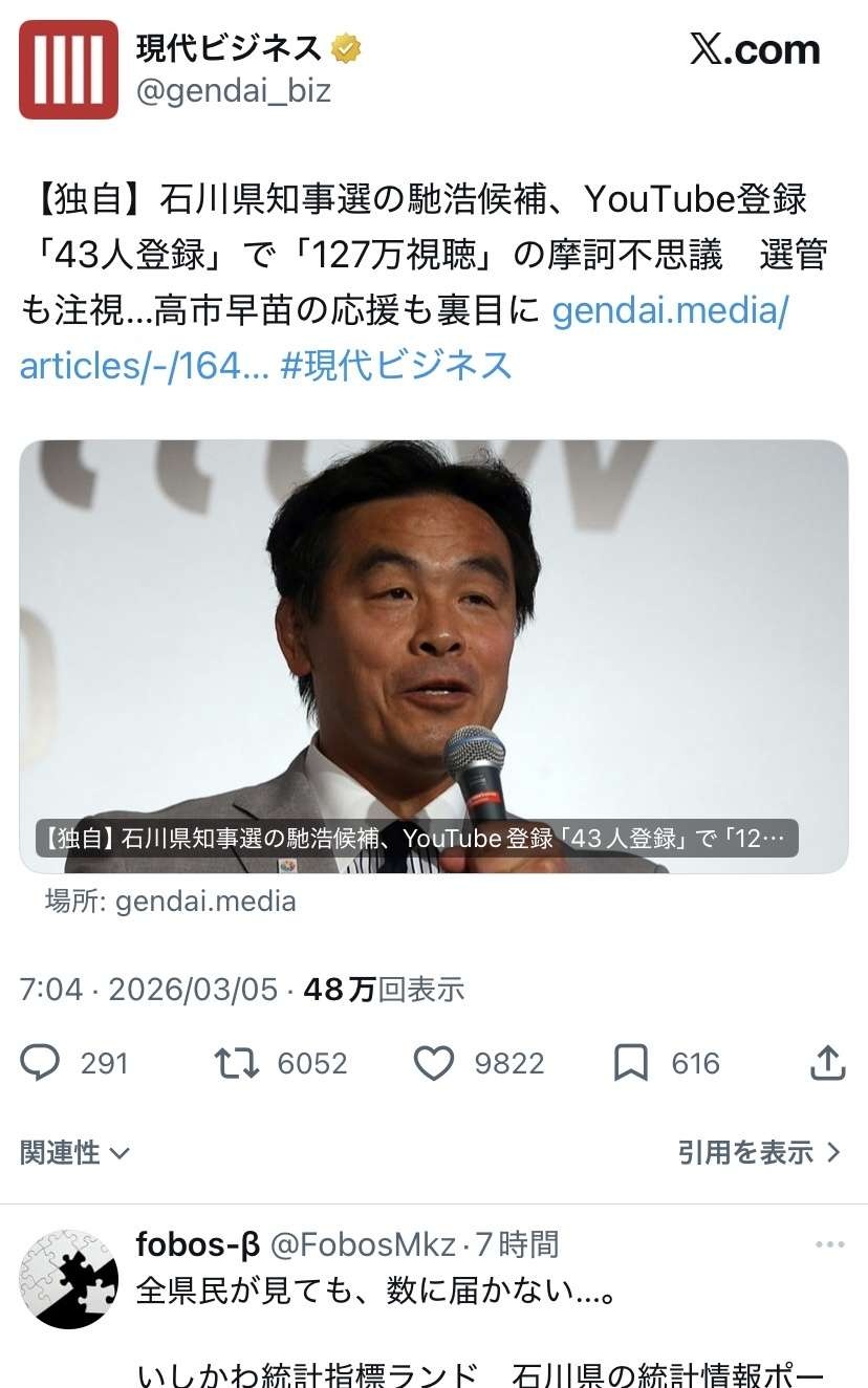 【独自】石川県知事選の馳浩候補、YouTube登録「43人登録」で「127万視聴」の摩訶不思議 選管も注視…高市早苗の応援も裏目に石川県知事選において、自民党推薦の馳浩氏がやっていることとは?gendai.media
