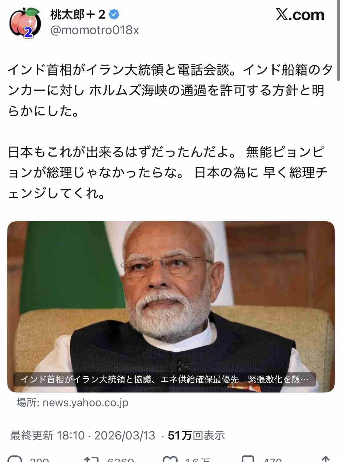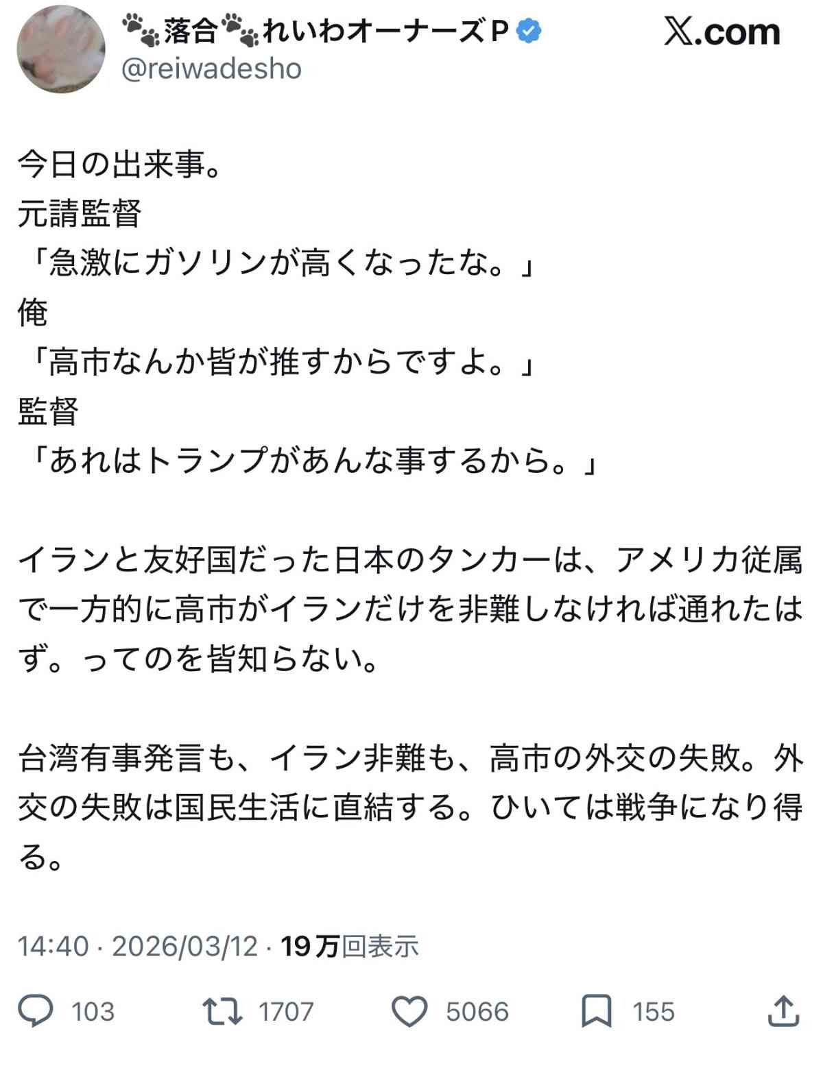 誰が首相やってても結果は同じかもしれんけど少なくともサナ以外やったら中東諸国煽るような真似はせんて